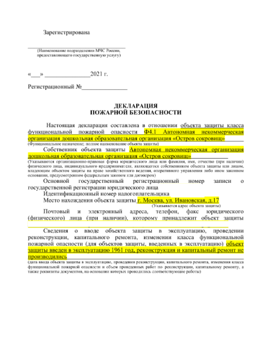 Декларация пожарной безопасности на детский сад «Остров сокровищ» было оформлена за 2 рабочих дня. После передачи документа в МЧС регистрация прошла за 3 дня. У МЧС не возникло претензий по содержанию и форме декларации.