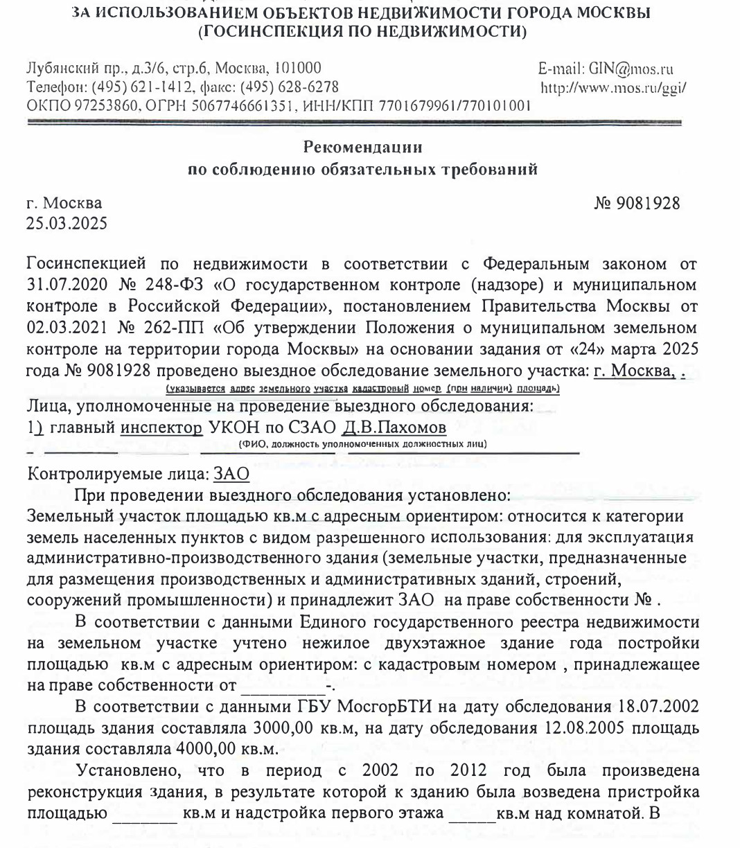 Росреестр. В октябре 2025 года клиенту поступил запрос от ГИН о том, что площадь объекта в ЕГРН в 2012 году изменилась существенно (было 3000 кв.м, стало 3500), а разрешение и акт ввода не приложены — информация ушла в ДГИ, иск в суд отправлен в декабре 2025 года.