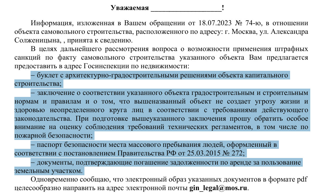 Для комиссии нужна следующая обосновывающая информация — чиновники выдают вот такие письма о требованиях к документам: