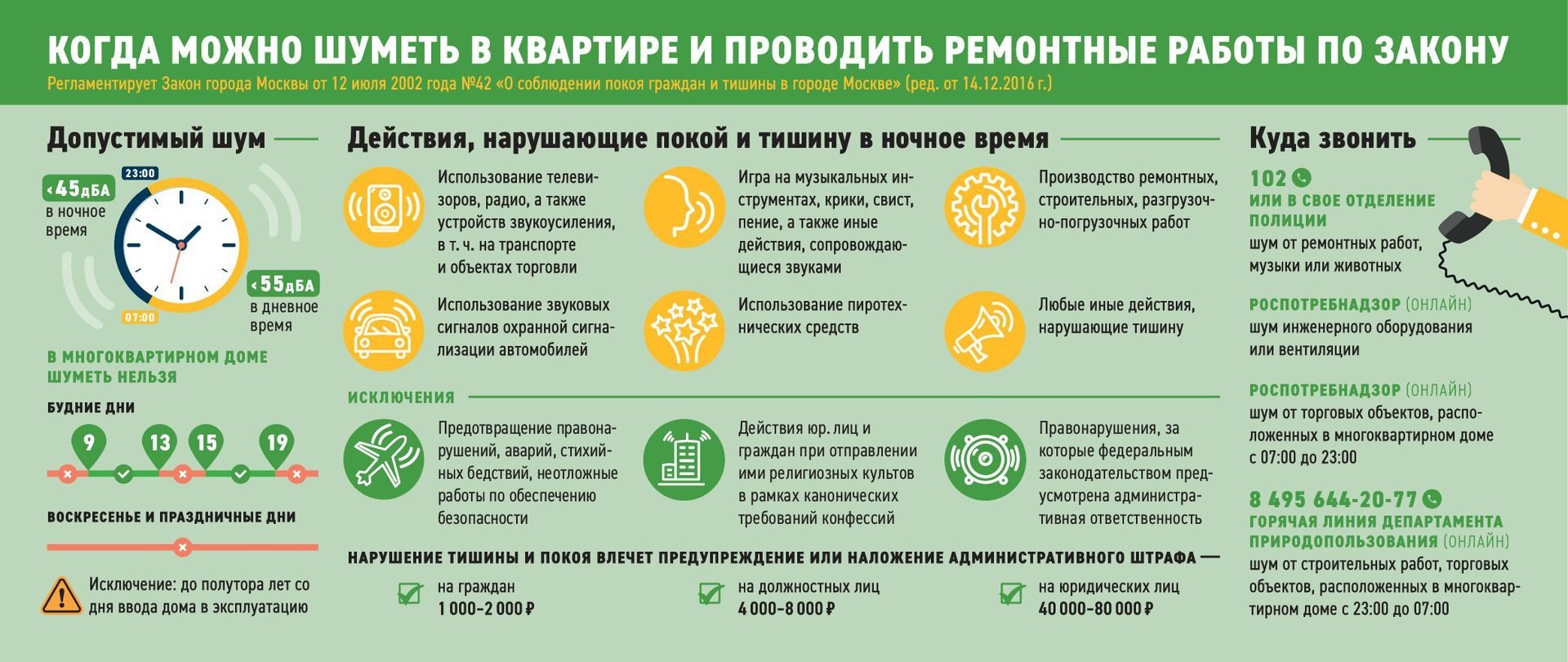 С 2002 года в Москве действует региональный Закон N 42. Последние изменения в него вносили в 2016 году. Сразу оговорено, что запрещено производство ремонтных и строительных работ, влекущее нарушение покоя граждан и тишины в ночное время. Здесь нет оговорок по предельному уровню шума, так как это компетенция указанного выше СанПиН 1.2.3685-21.