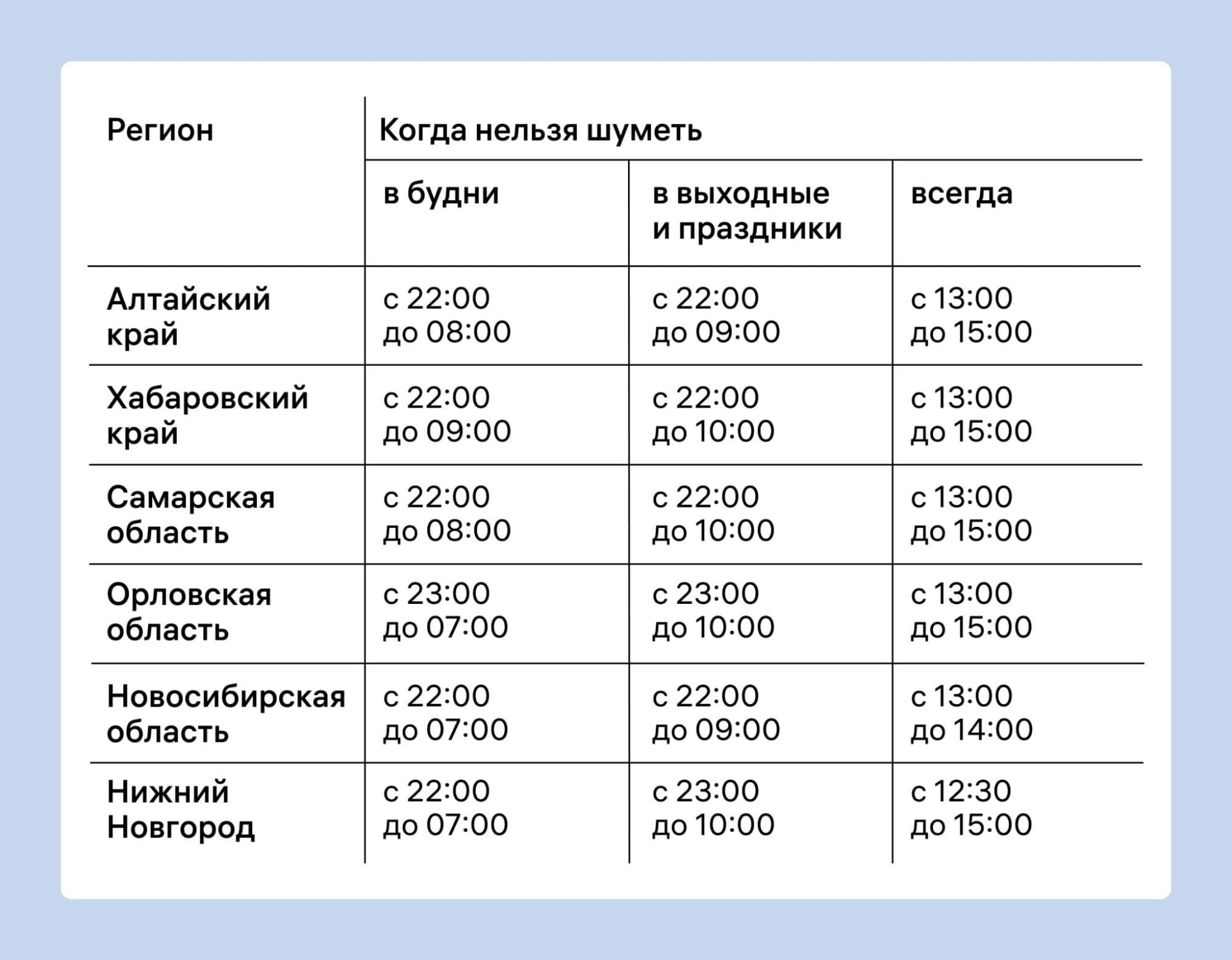 В том или ином виде, каждый регион давно принял нормативные акты по соблюдению тишины в многоквартирных домах. Отличия заключаются только в точном времени, а также в обязанности прекратить шумные работы в течение будних дней. В связи с этим интересно следующее: